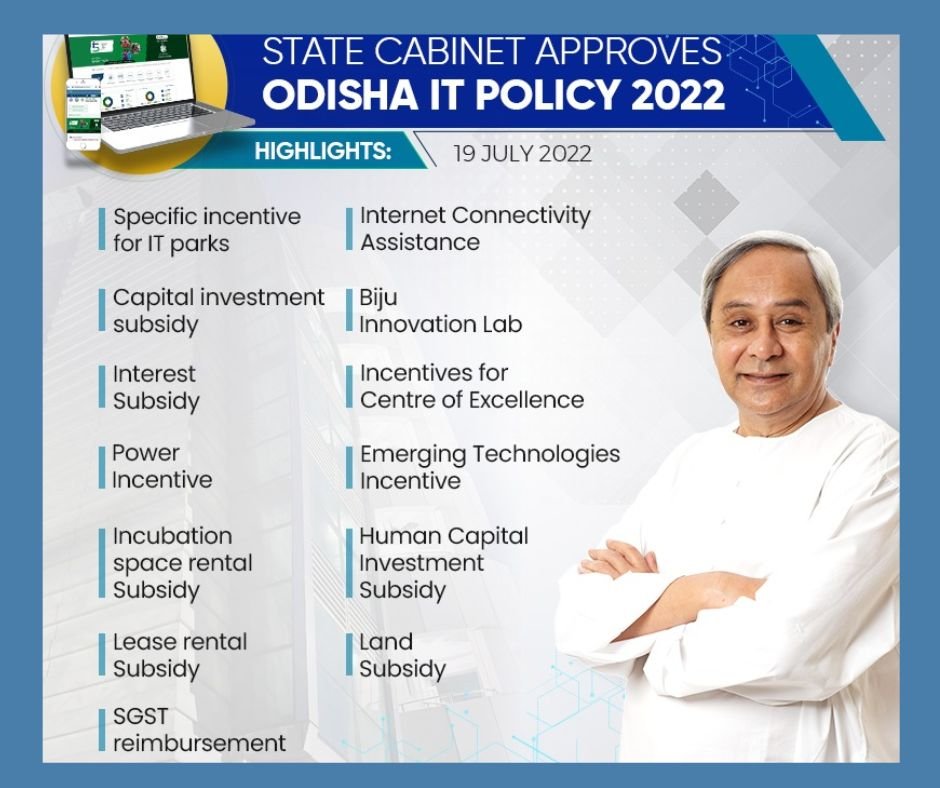 The State Cabinet of Odisha headed by CM Naveen Patnaik has approved the Odisha IT Policy 2022 on 19 July 2022. This will likely to transform Odisha into leading destination for IT investment. This will also position the state as an attractive destination for the industry, creating employment opportunities and inclusive growth.