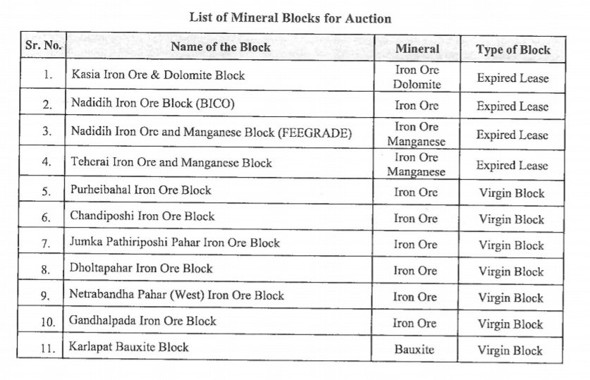 The seven iron ore blocks offered for e-auction are– Nadidih (Bico), Purheibahal, Chandiposhi, Jumka Pathriposhi, Dholtapahar, Netrabandha Pahar (West) and Gandhalpada.